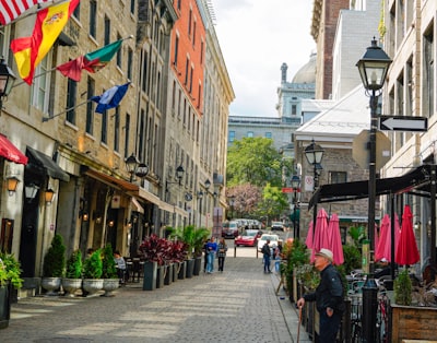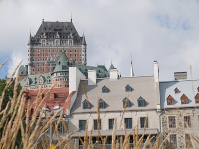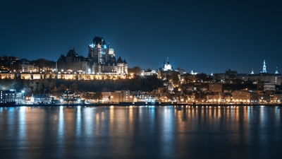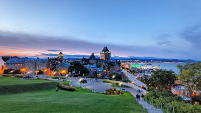 Cobblestone street lined with buildings and outdoor cafes.city skyline during night timea building with a clock towerA view of a city with tall buildingscars parked near brown and gray concrete building during daytimeFairmont le château frontenac hotel overlooking quebec city harborfew cars on road near concrete buildings viewing seaa scenic view of a city at dusk