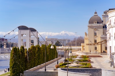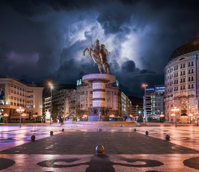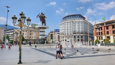 a statue of a man on a horse in a plazaMacedonia Square, Skopje during daytimeaerial photography of city buildingsa view of a city with a mountain in the backgrounda statue of a man riding a horse in a plazaCity skyline with mountains in the background.people walking on park near white concrete building during daytimea view of a city with a river running through it