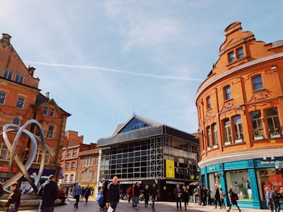 a group of people walking down a street next to tall buildingsClose-up of a historic clock tower against a blue sky.a building that has a bunch of signs on ita group of people on a rocky beachA tall clock tower against a blue sky.Ornate stone building with many windowspeople walking beside buildings under cloudy sky with contraila large green landscape