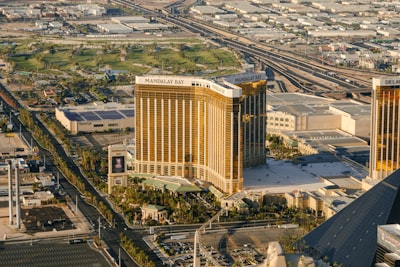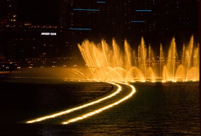 a large fountain of water is lit up at nightA view of a city from a plane windowAn aerial view of a city with a lot of tall buildingsA helicopter is parked on the side of a mountainA couple of planes that are on a runwayA view of a mountain range from a plane windowa group of people standing next to a street signa row of gondolas sitting next to a building